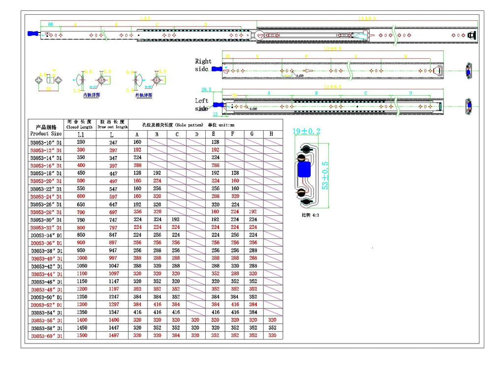 【Brand】YM【Name】53mm width Heavy Drawer Slides Locking Bearing【Length】 10" to 50"【Width】 53mm【Thickness】 2.0mm【Pull open method】Three section【Installation clearance】 19mm +-5【Maximum load】 265 lbs【Material】Q235 steel